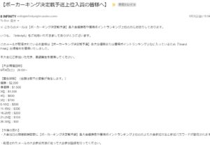 14日(土)にInfinity8というオンラインカジノ主催の「ポーカーキング決定戦」予選大会で、ポーカー初心者にもかかわらず、154名中5位に入賞しました。
